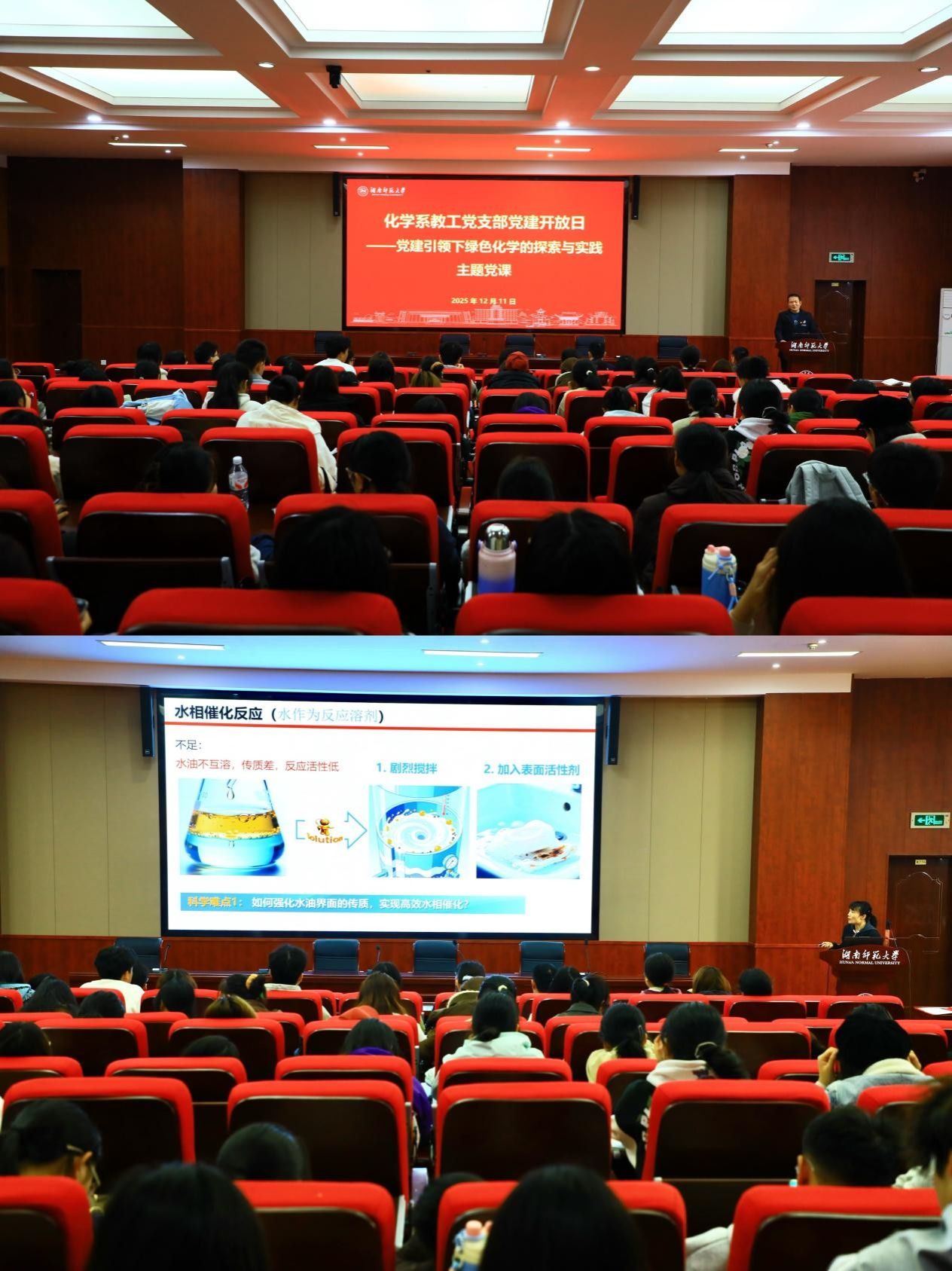 在主题党课环节,支部党员、副经理谭蓉教授以“党建引领下绿色化学的探索与实践——水中的有机反应”为题,系统讲解了绿色化学理念在科研中的实践,并结合前沿成果展示了其在生活中的应用,体现了党建工作对科研创新的引领作用。