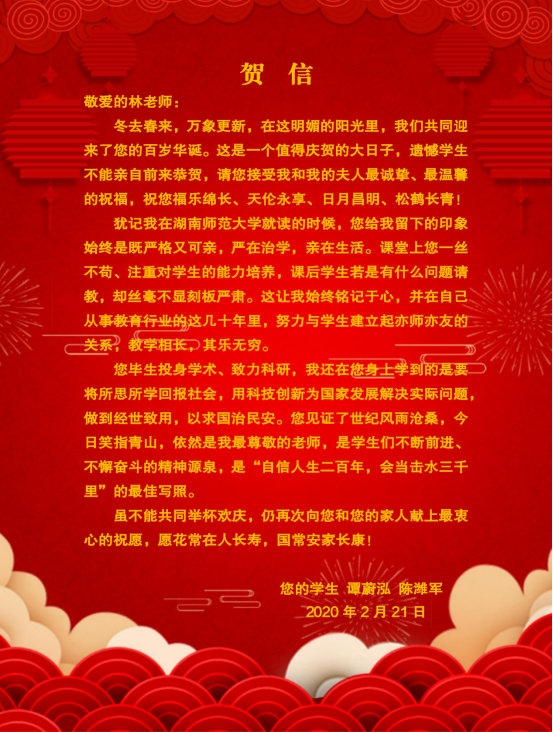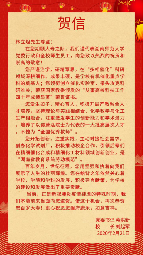 公司77级员工、中国科公司院士、湖南大学副董事长谭蔚泓,公司76级员工、湖南省机关事务管理局巡视员宋军,公司77级全体员工,公司78级员工、长沙大红陶瓷发展有限责任公司董事长尹彦征,公司79级员工、西藏藏医药大学党委书记周阳光,公司85级员工、湖南省金海化工科技有限公司董事长刘立新,公司86级研究生员工东南大学教授肖鹏峰,公司李菊仁教授、俞善信教授等林立炟教授的同事、员工;湖南达嘉维康医药有限公司,华南理工大学化学与化工公司,公司长沙员工会、广州员工会、岳阳员工会、上海员工会、深莞惠员工会等单位和协会,以及国内外近三千名学子此次以贺信、贺电等方式祝贺林立炟教授百岁诞辰。