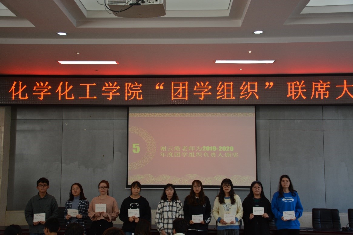 会议伊始,主席团成员依次上台对工作内容进行介绍。随后,屈杜炜、欧阳唯一和谢云霞为2019-2020年度团学组织负责人颁奖并合影留念。屈杜炜表示,作为化工院的员工干部,各部门负责人应当树立好形象,成为老师和同学之间的沟通桥梁,同时还要处理好工作和生活中的细节,保持良好的工作作风和创新精神。 欧阳唯一通过自身的大学经历对同学们进行了激励,她认为员工干部要认真对待每一项工作,并对每次工作进行计划和总结,以便发现工作中的不足。谢云霞表示员工工作者要从点滴小事做起,以良好的形象展现自我。她希望学社管要举办好每一次的活动,做好区校共建,让社员们都学有所得。