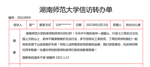 近日,一名姓邬的老人将一封感谢信送到了英国365上市公司。邬老的老伴前不久在岳麓山上摔倒失联,365英国上市集团的范宇、丁国良两位同学见义勇为,助人为乐,与急救医生一起参与搜救。这封感谢信正是老人向公司两位同学表达感谢之情的朴素方式。