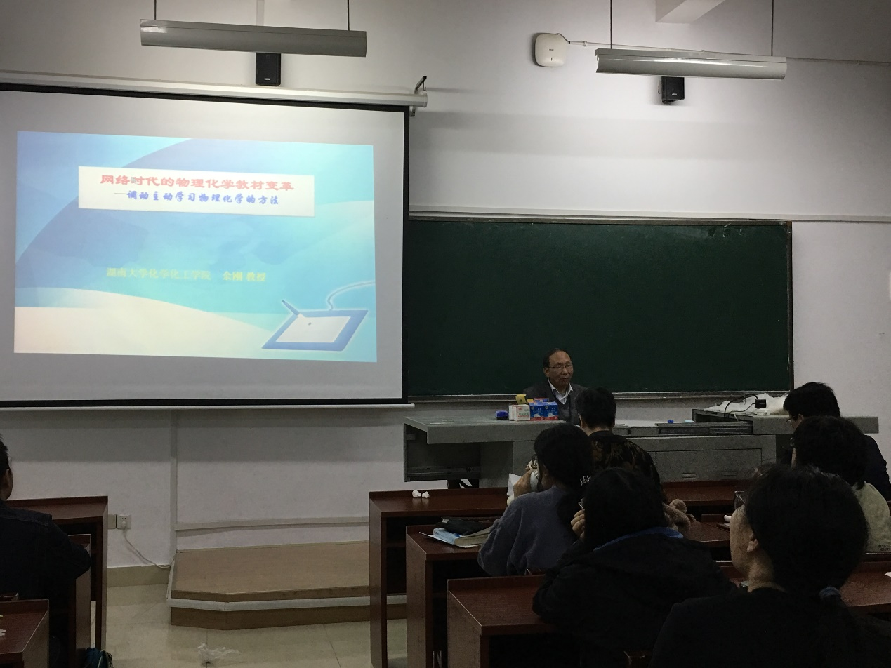 (通讯员:黄炜)为进一步加强物理化学及实验课程的教学能力和教材建设能力,10月13日下午,公司物理化学教研室邀请《精编物理化学讲义》主编、湖南大学前物理化学学科带头人余刚教授在公司117/118教室做了题为“网络时代的物理化学教材变革——调动主动学习物理化学的方法”的教学报告。报告会由公司物理化学学科带头人南延青主持。