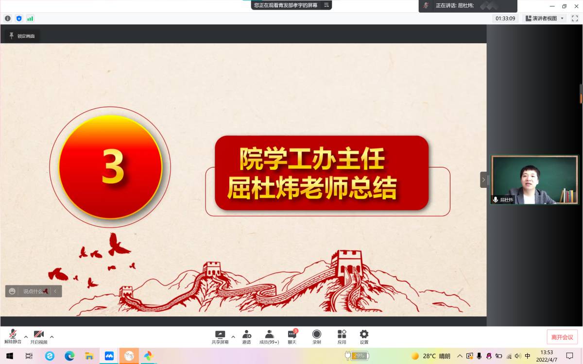 随后,校权益维护部负责人李彤、校员工社团管理服务中心监察部负责人张鹤馨、院团委员工副书记马明宇、院员工会主席王贺雷、院员工会主席刘嘉怡、院员工社团管理服务中心主任曾丹和院青年传媒中心主任黄贤帅依次进行发言,他们分别从个人情况、工作回顾以及展望未来三个方面对近一年来的工作向大家作出了汇报。