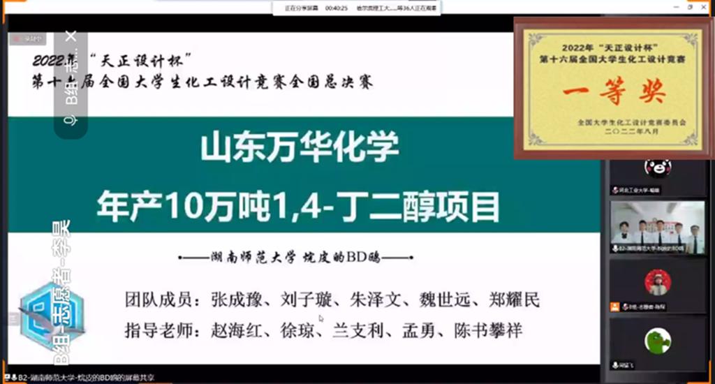 8月21日至22日,由中国化工学会、中国化工教育协会主办,华东理工大学承办的2022年“天正设计杯”第十六届全国老员工化工设计竞赛全国总决赛以线上形式举行。2019级本科生参赛队斩获全国一等奖。