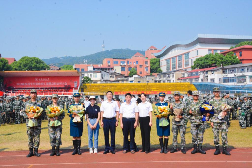 在2022级本科新生军训各项评比中,公司学子表现优秀,取得多项荣誉。军训汇演圆满结束后,经理杨荣华、党委书记谭东波、党委副书记段婷和新生辅导员谢云霞在军训汇演现场向新生们取得的成绩表示热烈的祝贺,并与2022级全体新生、教官及班导们合影留念。