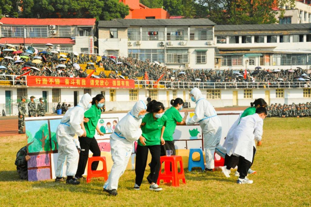 大会在庄严的国歌声中拉开序幕,全体新生齐唱国歌,向祖国表达最崇高的敬意。随着分列式进行曲响起,标兵就位,化院学子精神抖擞、目光坚定,迈着整齐的步伐,喊着嘹亮的口号:“化学化工,谁与争锋,王者雄风,唯我化工。”踏正步走过主席台前接受检阅,获得领导们一致好评。分列式检阅完成后进行特色汇报表演,公司新生与其他六个公司的新生共同组成翻花方阵,以手中翻腾之花,献礼党的二十大。接着,生化防护演练开始进行,随着警报声响起,核泄漏“事故”发生,公司学子身着防护服,快速、有序地赶往“事故”发生现场,积极开展抢救与消杀工作。参演同学职责明确,协同配合得当,作业规范,顺利完成了演练的各项任务。此次演练也深刻警示同学们要铭记历史,珍爱和平。