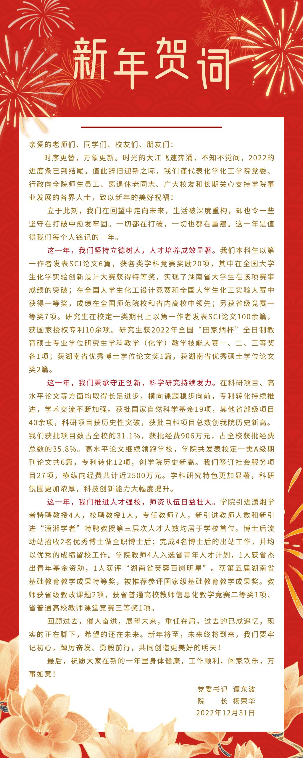 时序更替,万象更新。时光的大江飞速奔涌,不知不觉间,2022的进度条已到结尾。值此辞旧迎新之际,我们谨代表公司党委、行政向全院师生员工、离退休老同志、广大员工和长期关心支持公司事业发展的各界人士,致以新年的美好祝福!