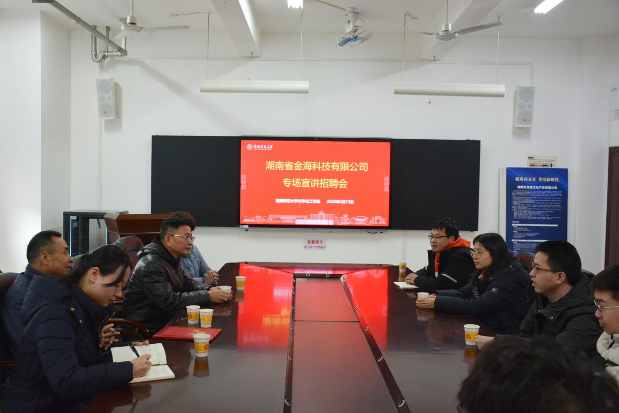 (通讯员 姜文滔)2月15日上午,湖南省金海科技有限公司专场宣讲招聘会在公司206会议室举办。公司党委书记谭东波、党委副书记段婷、副经理宋春红和公司优秀员工、湖南省金海科技有限公司董事长刘立新出席本次招聘会。招聘会由2023届毕业生辅导员唐健清主持。