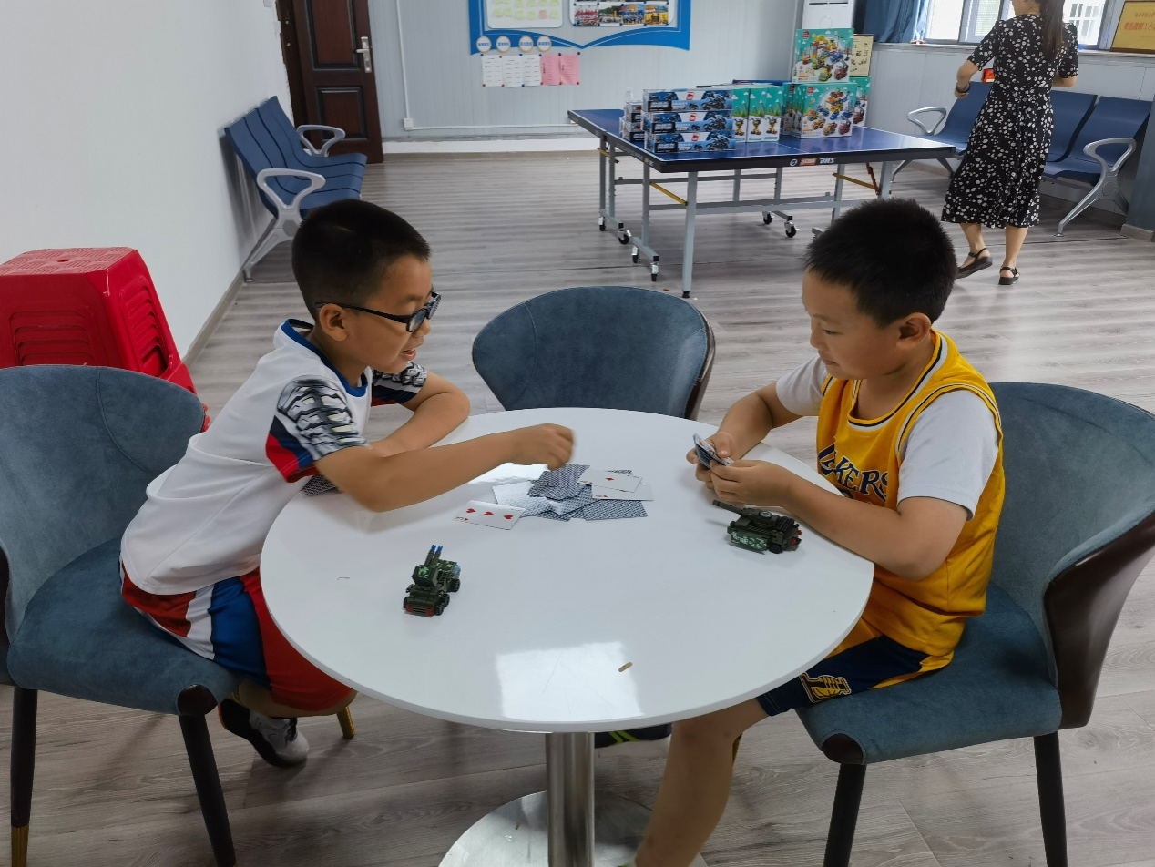 在家长的陪同下,孩子们积极投入到各项活动中。孩子们猜谜语、写祝福、打牌、下棋,有的孩子则迫不及待地将拼插玩具进行组装,教职工小家里到处洋溢着小朋友们的笑声、欢呼声与喝彩声。孩子们的快乐也感染了老师们,大家一起沉浸在童真的欢乐里!