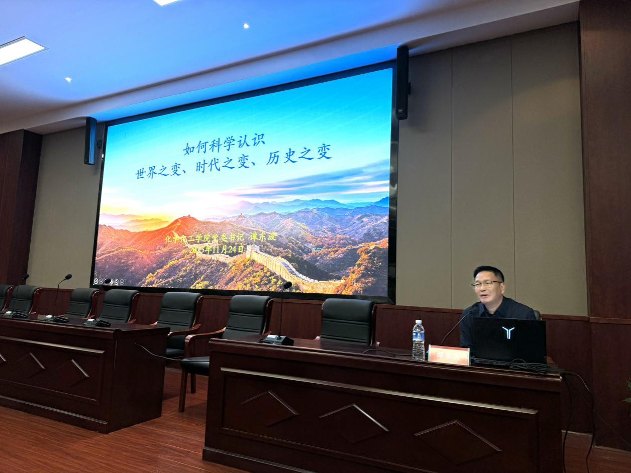 (通讯员 敖妍琦 张晓晨)为深入学习贯彻习近平新时代中国特色社会主义思想和党的二十大精神,用党的创新理论铸魂育人,11月24日晚, 公司党委书记谭东波以“如何科学认识世界之变、时代之变、历史之变”为主题,为2023级本科新生讲授形势与政策课。