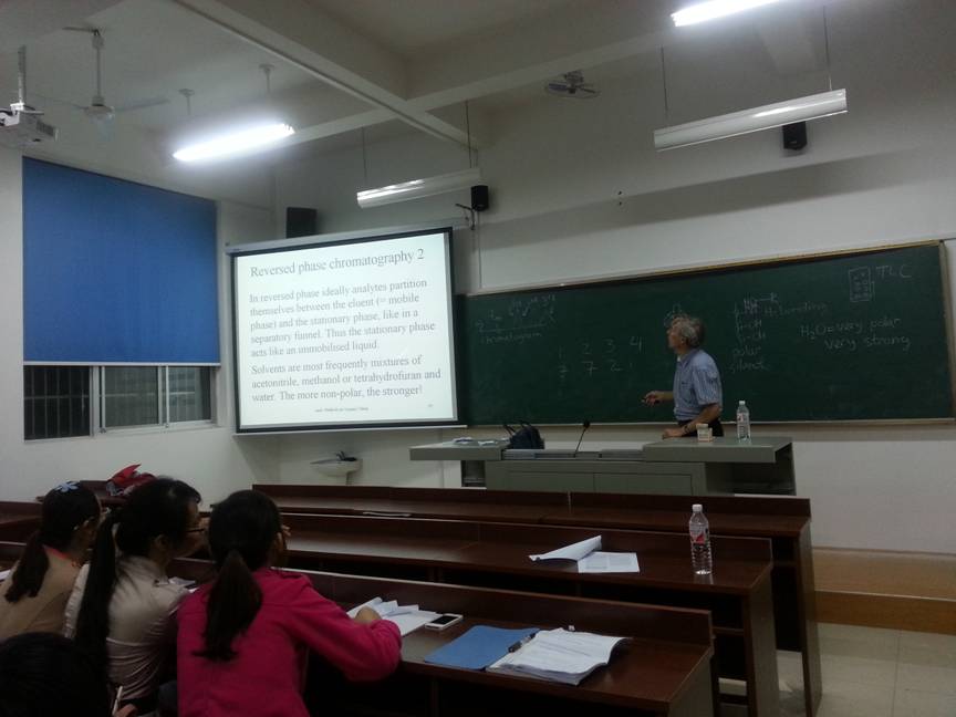 10月30日,荷兰Wageningen大学Teris A.Van Beek教授来公司交流访问,对公司化员工物学及中药分析教育部重点实验室的建设和科研情况给予充分地肯定。为加强与公司师生的交流,Teris于30日晚上7点给分析化学和药物分析学专业的研究生做了一场精彩的学术讲座。 讲座分为两部分,第一部分由Teris介绍他的研究方向和色谱研究领域一些新技术的应用,主要从新型敞开式质谱的应用、色谱分离技术、微流控芯片应用等方面展开讲解,并以通俗易懂的方式让在场的师生对于国外色谱分离分析新技术有一个直观的认识和了解。第二部分为互动环节,Teris准备了几道测验题并让在场的员工们解答。通过统计与总结,对同学们的共同错误进行详细地分析和讲解,让同学们对于色谱分离分析领域的一些实际性的问题有更深地认识。 讲座结束后,同学们热情地和Teris合影留念,互留联系方式,建立了更广泛地的友谊。
