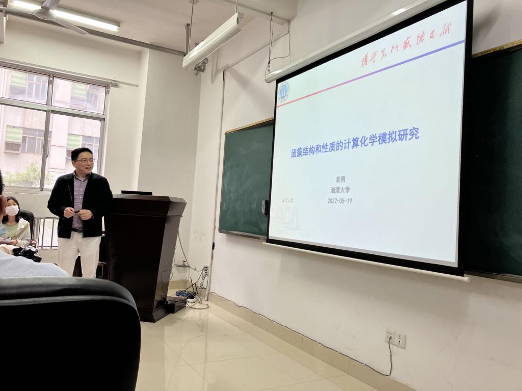5月19日下午,国自科优秀青年基金获得者、湖南省“芙蓉学者”、湘潭大学化学公司经理、博士生导师裴勇教授应邀来公司作了题为“团簇结构和性质的计算化学模拟研究”的学术报告。