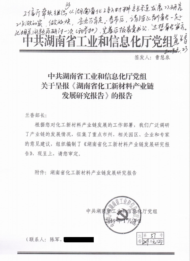 中共湖南省工业和信息化厅党组关于呈报《湖南省化工新材料产业链 发展研究报告》的报告