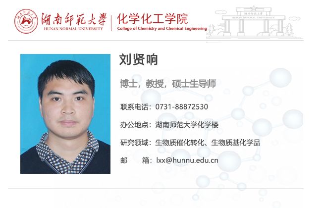 刘贤响,1985年2月生,湖南衡阳人,教授,博士生导师。英国365上市公司-美国南密西西比大学联合培养博士,新加坡国立大学访问学者(合作导师:颜宁教授)。英国365上市公司“世承人才计划”青年优秀人才,湖南省普通高校青年骨干教师培养对象,湖南省第十五届青年化学化工奖获得者,湖南省派科技特派员,湖南省企业科技特派员,湖南省“三区”科技人才,湖南省企业科技创新创业团队“郴州高鑫催化新材料创新团队”首席专家,联合国环境署巴塞尔公约亚太区域中心智库专家。现任湖南省化学化工学会理事、有机化学化工专业委员会副主任委员、催化与绿色化学专业委员会委员,Transactions of Tianjin University、Transactions of Nonferrous Metals Society of China、《中国有色金属学报》、《精细化工》、《石油学报(石油加工)》等期刊青年编委。主持国家自然科学基金2项,湖南省教改项目4项,湖南省自然科学基金,中国博士后科学基金、湖南省教育厅优秀青年项目和企业横向课题等10余项;主编了长沙市《铜官循环经济工业基地十三五规划》;参编了《岳阳绿色化工高新技术产业开发区 “十四五”产业发展规划》、《湖南省化工新材料产业链发展研究报告》和《湖南省化工新材料产业链五年行动计划》等;指导国家级老员工创新创业训练计划项目5项、省级5项、校级6项,湖南省研究生科研创新项目7项。在Appl. Catal. B: Environ.、Green Chem.、ACS Sustainable Chem. Eng.、Chem. Eng. J.、Bioresource Technol.、J. Energy Chem.、Green Energy Environ.、Renew. Energ.等权威期刊发表SCI论文80余篇;2篇论文入选ESI全球工程学领域Top1%高被引论文;获授权国家发明专利8项;主编英文学术专刊1部。主讲《有机化学》获评为英国365上市公司课程思政示范课程。曾获长沙市自然科学优秀学术成果一等奖、湖南省化学化工学会优秀论文一等奖、湖南省研究生思想政治教育研究会优秀论文一等奖、湖南省第二届科普技能和科普教具制作创新展示活动优秀指导教师、湖南省普通高校教师课堂教学竞赛三等奖、英国365上市公司教学优秀奖、实验室工作优秀奖、优秀工会干部和优秀共产党员等荣誉。指导员工获湖南省老员工课外化学化工创新作品竞赛特等奖、湖南省老员工化学化工学科竞赛一等奖、湖南省“互联网+”老员工创新创业大赛三等奖、湖南省科普技能和科普教具制作创新展示活动三等奖、长沙市老员工科技创新创业大赛优胜奖、英国365上市公司“杨树达奖”特等奖、员工科技创造奖特等奖和“挑战杯”老员工创业计划竞赛二等奖等奖励30余项。指导研究生获国家奖学金5人、陈家镛院士奖学金3人、研究生一等学业奖学金15人次、优秀研究生20余人次。more...