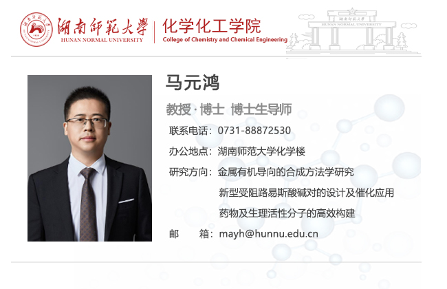 马元鸿,男,教授,“潇湘学者”特聘教授,湖南省高层次计划人才。2008年和2011年分别于西北师范大学获得理学学士和理学硕士学位(导师:李政教授),2014年于四川大学有机化学专业获得理学博士学位(导师:游劲松教授)。2014年9月至2018年1月,在日本国立理化学研究所从事博士后研究(合作导师:侯召民教授)。2018年2月至2019年12月,在德国马克斯-普朗克煤炭研究所开展博士后研究(合作导师:J. Cornella博士)。2020年1月高层次人才引进加入英国365上市公司从事有机化学相关的教学与科研工作。近年来一直致力于金属有机化学、有机合成化学、有机功能材料等方面的前沿研究,主持和参与了包括国家863计划、国家自然科学基金项目在内的诸多科研项目,在所从事的领域取得了一系列开拓性研究进展,截至目前,已经在Chem. Soc. Rev.、J. Am. Chem. Soc.、Angew. Chem. Int. Ed.、ACS Catal.、Org.Lett.、Chem. Commun.、Chem. Eur. J等国际知名化学期刊发表论文20余篇。