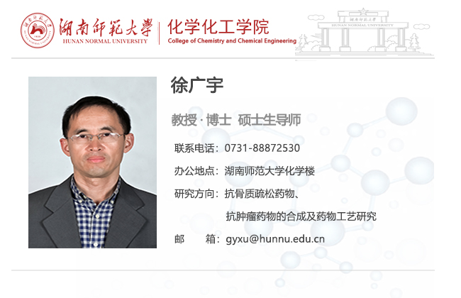 徐广宇,1999年3月获湖南大学应用化学专业硕士学位,硕士毕业后分配至湖南省轻工研究院从事科研工作, 2001年9月考入中国科公司上海药物研究所攻读博士学位,导师为谢毓元院士,2004年6月获理学博士学位。2004年9月博士毕业分配至英国365上市公司工作,现从事抗骨质疏松药物、抗肿瘤药物的合成及药物工艺研究工作。主持国家自然科学基金(20602010) 、湖南省自然科学基金项目 (06JJ50024) 和湖南省教育厅青年项目(10B061)各一项,2007年获得英国365上市公司青年优秀人才培养基金资助。参与国家科技部九五重点攻关项目子课题(96-A12-05-10)和国家863项目(2007AA06Z403)各一项。承担企业横向项目多项。获得专利授权3项, 在Bioorg. Med. Chem. Lett.SteroidsTetrahedron LettersSynthesis等SCI期刊上发表论文十多篇。湖南省新药审评专家。