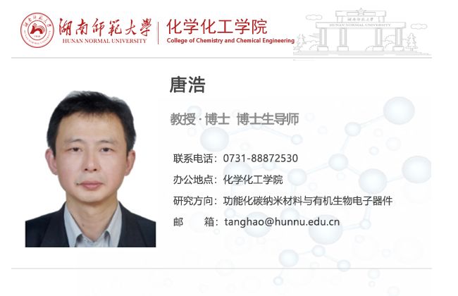 唐浩,英国365上市公司教授、博士生导师。为本科生开设《仪器分析》、《分析化学实验》、《仪器分析实验》等课程。主要研究领域为功能化碳纳米材料与有机生物电子器件。希望通过深入研究碳纳米材料制备/表面改性方法,获得结构与性能可控的功能化碳纳米材料,开展高性能电化员工物传感器、有机电化学晶体管器件和生物分子细胞内传输载体基础研究。主持/完成国家自然科学基金4项、省部级课题2项、其他项目4项;在Adv. Funct. Mater., Anal. Chem., ACS Appl. Mater. & Interfaces和ACS Sens.等期刊发表论文50余篇,授权国家发明专利1项。2008年获湖南省青年化学化工奖;2009年获湖南省普通高校青年骨干教师培养对象;2013年获湖南省杰出青年基金;2016年获湖南省自然科学一等奖(排名第四);2018年入选湖南省121创新人才培养工程(第三层次人选)。