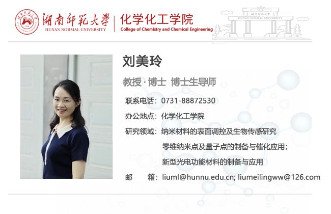 刘美玲,理学博士,教授,博士生导师,湖南省芙蓉学者青年学者,湖南省芙蓉百岗明星获得者,湖南省青年骨干教师培养对象。2006年硕士毕业留校工作,2012年获得理学博士学位。2017年6月-2018年6月在加州大学洛杉矶分校访学。主要从事生物药物分析、化员工物传感及诊疗应用等领域的研究工作。曾获湖南省自然科学奖二等奖、湖南省优秀博士论文和湖南省优秀硕士论文奖等奖项。主持和完成4项国家自然科学基金、多项湖南省科技厅、教育厅及企业合作课题。在Adv. Mater., Sci. China Chem., Angew. Chem. Int. Ed., Anal. Chem.等国内外刊物发表论文150余篇,被Chem. Rev等SCI期刊他引7100多次,H-index 47,多篇论文进入高被引行列。