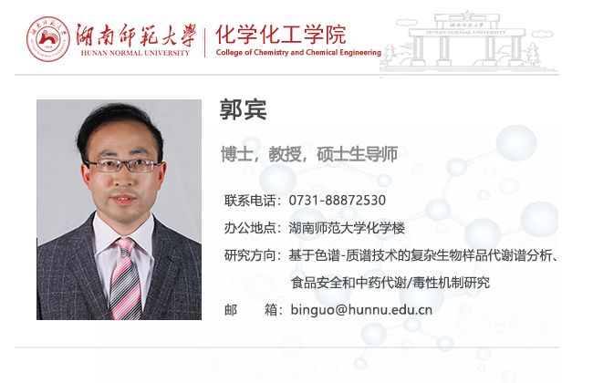 主要从事基于色谱-质谱技术的复杂生物样品代谢谱分析、食品安全和中药代谢/毒性机制研究。在相关领域重要学术刊物以第一或通讯作者发表高质量论文30余篇(总被引用次数1000以上、h-index 20、RG score 36.59),参与出版专著3部、获国家发明专利5项。主持完成国家自然科学基金项目2项,参与完成一类新药临床前药代及毒代动力学研究1项、广州市科技攻关重大项目1项、国家自然科学基金3项、863计划课题3项。曾获英国365上市公司“杨树达奖”学术作品类一等奖、中科院上海分院第三届研究生学术讨论会论文二等奖、湖南省优秀硕士论文奖、湖南省科技进步二等奖、中国中西医结合学会科学技术三等奖等。现为美国生物化学与分子生物学学会ASBMB、中国药理学会、中国化学会和中国毒理学会会员;担任国际期刊Current Drug Metabolism编委、中国药理学会药物代谢专业委员会委委员、湖南省预防医学会食品安全专业委员会常务委员、植化单体开发与利用湖南省重点实验室学术委员会委员等职。为Anal Chem、 Biosens Bioelectron、J Chromatogr A等7家国际期刊审稿人,获Elsevier杰出审稿人奖(Outstanding Reviewer Award 2015、2018)。