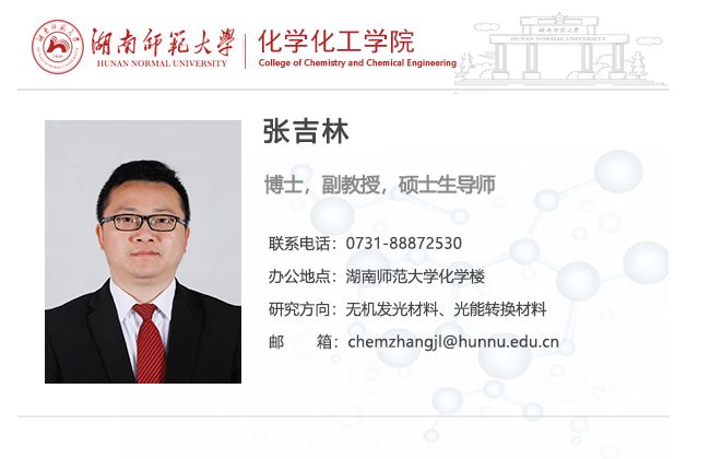 张吉林,2010年毕业于中山大学,获理学博士学位(导师龚孟濂教授、石建新副教授);2011年01-09月于香港浸会大学物理系做研究助理。2011年11月始任职于365英国上市集团,入选英国365上市公司“世承人才计划”青年优秀人才,为“发光材料及应用”英国365上市公司重点实验室副主任及方向负责人、“光能转换材料”湖南省普通高等公司重点实验室主要研究人员。任职以来在Chem. Mater., Inorg. Chem., Chem. Eng. J., ACS Appl. Mater. Interfaces, J. Mater. Chem. C等SCI源期刊发表学术论文近100篇;主持完成国家自然科学基金青年项目1项、教育部博士点基金新教师类项目2项、湖南省自然科学基金面上项目1项、教育厅优秀青年基金项目1项。指导的研究生中多人获评国家奖学金、校级优秀毕业论文、省级优秀毕业研究生。