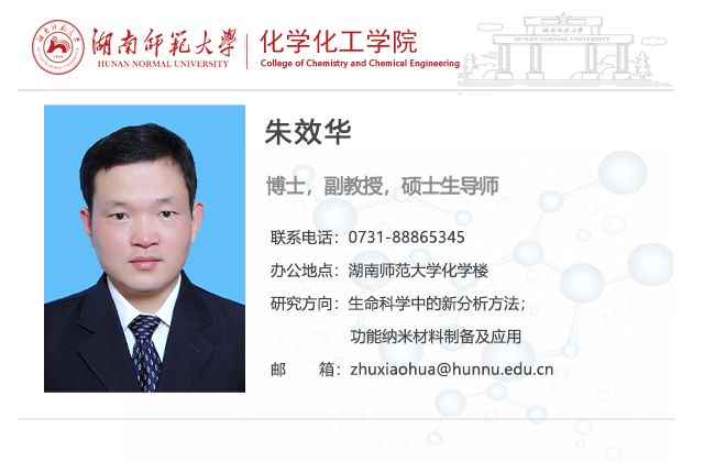 朱效华,男,副教授,硕士生导师。2018年6月毕业于湖南大学获理学博士学位,师从姚守拙y院士与聂舟教授,2014年7月-2015年10月在清华大学联合培养。2019年1月加入365英国上市集团,从事分析化学领域的教学与研究工作。先后主持家自然科学基金、湖南省自然科学基金。目前以通讯/第一作者身份在ACS Nano, Anal. Chem.等国内外学术期刊发表论文40余篇,ESI高引论文3篇。