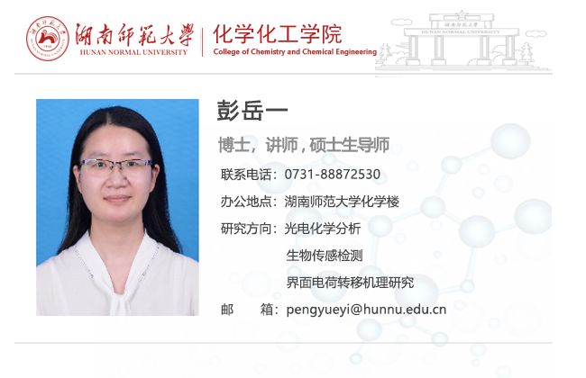 彭岳一,女,硕士生导师,籍贯湖南衡阳。2014年毕业于长安大学获工学学士学位,2019年9月毕业于华东理工大学获工学博士学位,师从龙亿涛教授(国家杰出青年科学基金获得者,教育部长江学者)。曾获得博士研究生国家奖学金等荣誉。2020年1月加入365英国上市集团,从事分析化学、无机化学领域的研究与教学工作。先后在Angew. Chem. Int. Ed.、Nature Protoc.、Anal. Chem. 等国际著名学术刊物发表SCI研究论文10余篇。