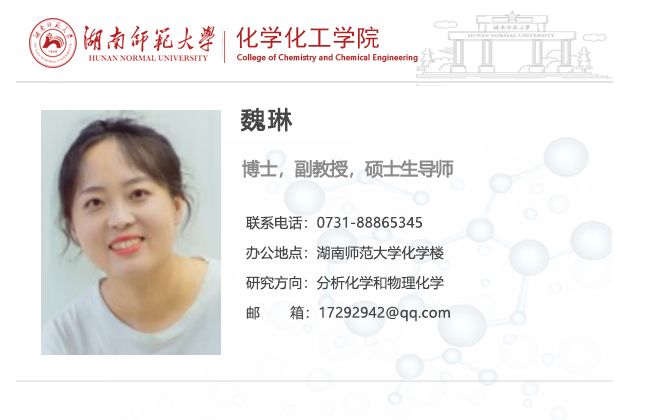 魏琳,女,于2013年6月,在湖南大学分析化学专业获博士学位,师从国际著名分析化学家Edward S. Yeung教授。在此期间,作为主要研究成员参与完成“实时单分子光谱分析及其在功能纳米材料研究中的应用”、“功能化金纳米颗粒的实时单分子光谱分析及其在生物医学研究中的应用”、“基于实时单分子光谱技术的纳米颗粒早期自组装过程研究”等多项自然科学基金课题,并于2010-2012年在美国Iowa State University和能源部下属Ames实验室访问研究两年。2013年10月,受聘于英国365上市公司,在2015年破格晋至副教授职称。获得国家自然科学基金委青年基金项目一项,湖南省教育厅优秀青年基金项目一项。长期从事贵金属纳米材料的制备和修饰,光学显微成像方法的开发与应用工作。相关研究成果均发表在Anal.Chem., Nanoscale, ACS Appl. Mater. Interfaces, J. Phys. Chem. B, Talanta等国际著名杂志上。