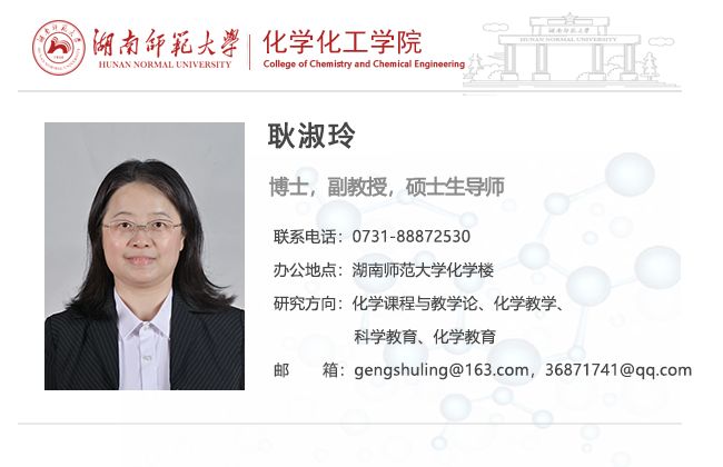 耿淑玲,女,吉林白城人,教育学博士,副教授,硕士生导师。连续多年主讲《化学课程与教学论》、《化学教育测量与评价》、《中学化学课程标准与教材研究》等课程。出版专著一部,发表论文三十余篇,其中多篇被人大复印资料全文转载。多次获得“全国高等院校化学专业师范生教学素质大赛优秀指导教师奖”,指导的员工多次荣获全国和省级的“师范生教学技能竞赛”一等奖。