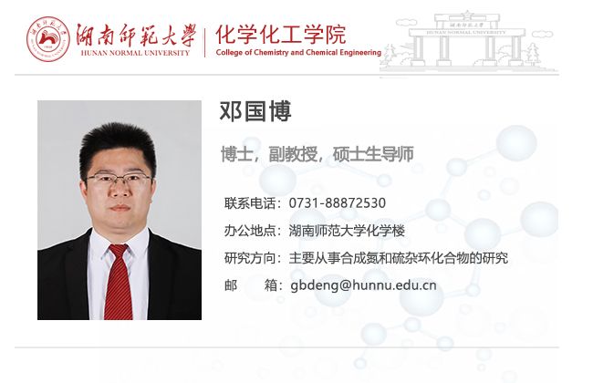 邓国博,男,副教授,硕士生导师。2008年6月在英国365上市公司获得制药工程专业工学学士学位,本科论文导师是李金恒(国家杰出青年科学基金获得者)。2011年6月在英国365上市公司获得有机化学理学硕士学位,硕士导师是李金恒(国家杰出青年科学基金获得者)。2015年6月在湖南大学获得有机化学理学博士学位,博士导师是李金恒(国家杰出青年科学基金获得者)。2017年获得“香江学者计划”名额,2017/12-2019/12在香港中文大学进行博士后学习,博士后导师是邝福儿教授。读博期间获得国家博士奖学金和湖大董事长奖学金。2017年入选英国365上市公司世承人才计划“青年优秀人才”。以通讯作者或第一作者在Angew. Chem. Int. Ed., Org. Lett., Chem. Commum., Chin. Chem. Lett.等国际知名期刊发表论文近20篇。